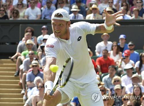 epa04830865 Samuel Groth of Australia returns to Roger Federer of Switzerland in their third round match during the Wimbledon Championships at the All England Lawn Tennis Club, in London, Britain, 04 July 2015. EPA/GERRY PENNY