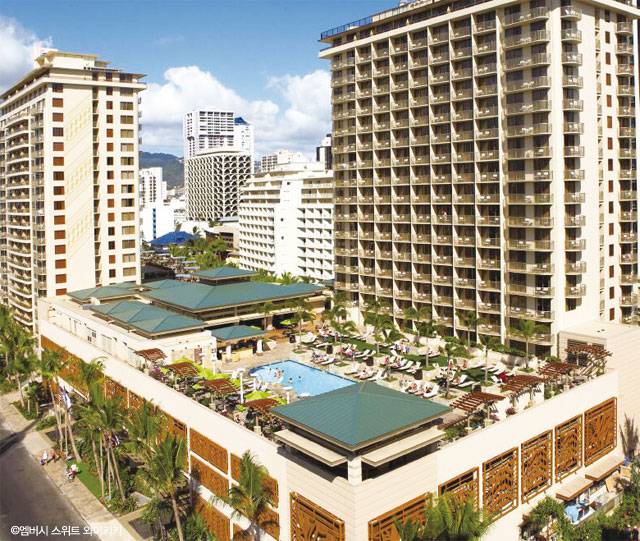 Hotel & Resorts와이키키 최대 규모 힐튼하와이안빌리지힐튼하와이안빌리지호텔은 6개의 타워와 5개의 수영장, 인공 라군 등을 갖춘 와이키키 최대 규모의 리조트로 유명하다. 와이키키 해변과 맞닿은 레인보우타워를 비롯한 6개의 타워가 제각각의 매력으로 일종의 작은 마을을 형성하고 있다. 매주 금요일 저녁마다 이곳에서 펼쳐지는 불꽃놀이는 하와이의 대표 이미지가 됐다.www.hiltonhawaiianvillage.com