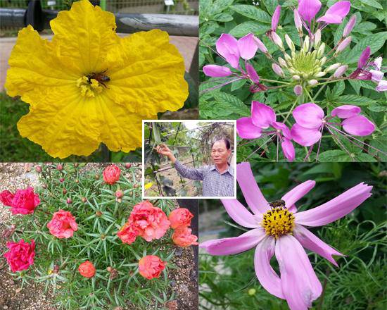 | ▲ 왼쪽 노란 꽃이 수세미 꽃이다. 수세미 꽃 자체도 50년만에 보는 것이라 반가웠고, 특히 꽃을 파고드는 벌의 모습도 신기하여 한 장 찍어보았다. 그 아래것은 손톱 물들이던 채송화. 채송화도 예전처럼 그렇게 흔한 꽃은 아니다. 가운데 흰 테두리 안의 작은 사진은 수세미의 특성에 대해 설명하고 있는 천대윤 씨의 모습이다. |