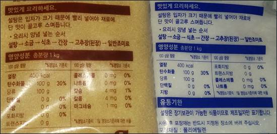 | ▲ 2015년 6월 현재 한 회사의 갈색설탕과 백설탕 성분. 크게 차이가 없다. |