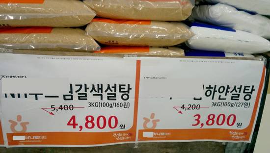 | ▲ 2015. 6월 현재 같은 회사의 같은 용량 갈색 설탕과 백설탕의 가격(다른 회사의 두 제품 5kg 갈색 설탕 5480, 백설탕 4350원) |