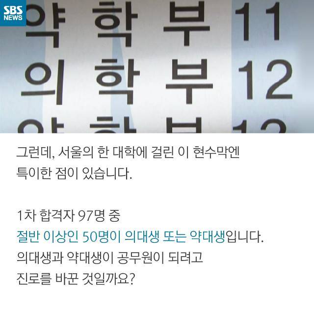 요즘 대학 캠퍼스에선 이런 현수막이 걸려 있는 것이 낯설지 않습니다. 그런데, 서울의 한 대학에 걸린 이 현수막엔 특이한 점이 있습니다. 1차 합격자 97명 중 절반 이상인 50명이 의대생 또는 약대생입니다.