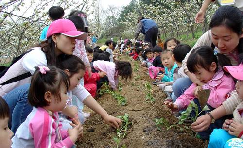 | 경기 양평군의 그린토피아 과수마을을 찾은 유치원생들이 농장에서 교사들과 함께 고구마 순을 심고 있다. 그린토피아 제공 |
