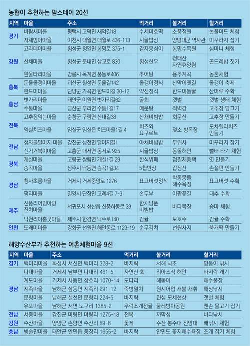 농촌이나 어촌에서 편안한 휴가를 즐기기 위해서는 간단한 사전 준비가 필요하다. 도시에서 떠나기 전 자신에게 어떤 곳이 맞는지 알아보는 것은 필수다. 이를 위해 농협에서 운영하는 홈페이지(www.farmstay.co.kr)를 통해 숙박부터 카드결제 가능 여부까지 다양한 정보를 얻을 수 있다. 어촌으로 떠나려면 바다여행(www.seantour.com)이란 사이트에서 사전 정보를 얻을 수 있다. 이곳에는 주제별, 놀거리별로 분류해 놓아 자신의 구미에 맞는 곳을 선택하면 된다. 어촌에 처음 가는 여행자들을 위해 먹거리와 볼거리를 담은 사진도 여러 장 올려놓아 참고자료로 사용할 수 있다.
