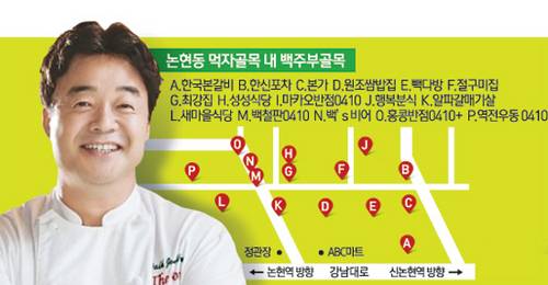 서울 지하철 논현역 2번 출구 인근 영동시장 먹자골목. 길을 따라 쭉 걷다 보면 건물 간판 위로 익숙한 얼굴과 '백'이라는 글자가 눈에 들어온다. 최근 텔레비전 요리 프로그램을 종횡무진하며 '백주부'로 인기를 끌고 있는 요리사 백종원 더본코리아 대표를 나타내는 상징들이다. 이곳에 있는 백 대표의 외식 브랜드만 무려 16곳. 올 초 문을 연 맥주전문점 '백's 비어', 커피전문점 '빽다방'은 물론 300m 안팎으로 더본코리아의 한식·중식·일식 브랜드가 줄지어 자리잡고 있다. 1990년대 초반만 해도 유입인구가 적었던 이 골목은 최근 백 대표의 유명세와 함께 '백주부 거리'로 회자되며 많은 이들의 이목을 끌고 있다. 주목받지 못했던 뒷골목이 '셰프테이너' 흐름과 맞물려 식도락 거리로 부상하면서 인근 상권도 덩달아 활기를 띠고 있다.