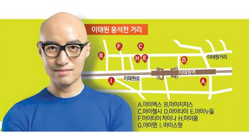 서울 지하철 6호선 이태원역 해밀튼 호텔 뒷골목에는 '홍석천 거리'가 있다. 골목을 걷다 보면 연예인 홍석천 씨가 운영하는 식당들이 즐비하다. 2002년 이탈리안 레스토랑 '아워플레이스'를 시작으로 태국요리 전문점 '마이타이', 퓨전 중식당 '마이차이나', 뉴욕 스타일 요리전문점 '마이첼시', 펍 '마이치치스' 등 이곳에만 9개의 식당을 열었다.