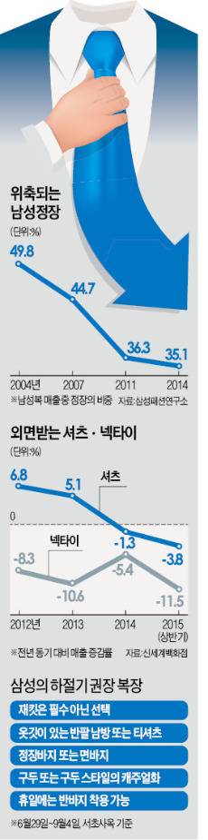 정장 수요가 꺾인 가장 큰 배경은 대기업들의 근무복장 자율화다. 1999년 CJ를 시작으로 삼성 LG SK 롯데 등이 줄줄이 비즈니스 캐주얼을 도입했다. 올여름에는 삼성이 주말 반바지 착용까지 허용하는 등 격식 파괴가 가속화하고 있다.