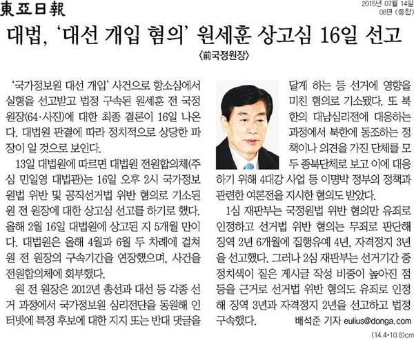 | ▲ 동아일보 14일자 보도. | ||