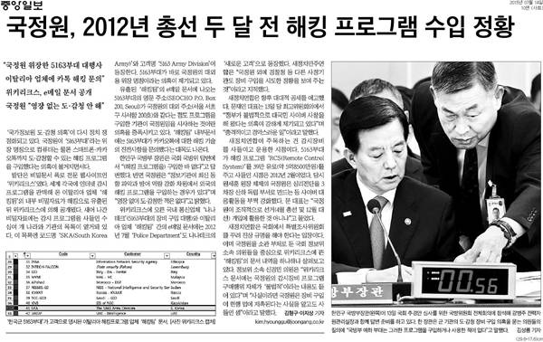 중앙은 "위키리크스에 오른 국내 통신업체 '나나테크'(5163부대의 장비 구입 대행)와 이탈리아 업체 '해킹팀' 간의 e메일 문서에는 2012년 7월 'Police Department'도 나나테크의 '새로운 고객'으로 등장했다"며 "새정치민주연합은 '국정원 외에 경찰청 등 다른 사정기관도 장비 구입을 시도한 정황을 보여 주는 것'이라고 지적했다"고 밝혔다.