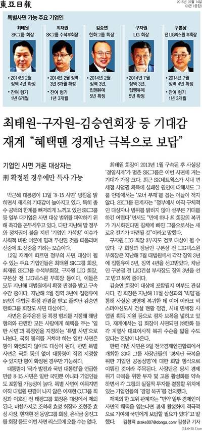 동아는 "박근혜 정부는 지난해 설날 한 차례 생계형 특별사면을 했으나 기업인과 정치인은 대상에서 제외했다"며 "법 집행에서 대기업 오너들에게 특혜를 주어도 안 되지만 기업인이라는 이유로 일부러 사면이나 가석방 대상에서 빼놓는 것도 '법 앞의 평등' 원칙에 맞지 않는다"고 밝혔다.