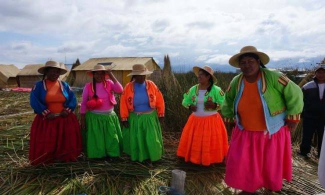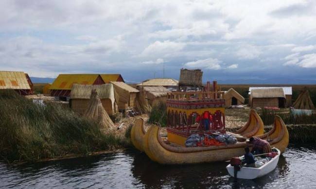 호수에는 잉카제국의 침입을 피해 자리 잡은 우로스족이 사는 섬이 40여개나 있다. 갈대를 엮어 물위에 띄운 이 섬은 물과 닿은 면의 갈대가 썩기 때문에 1주일이나 한 달 단위로 새 갈대를 엮어야 섬이 유지된다고 한다. 웬만큼 부지런하지 않으면 섬을 유지할 수 없다는 말이다. 섬마다 매여 있는 갈대로 만든 예쁜 배는 각 섬마다 모양이 조금씩 다르다. 갈대로 만들어진 인공 섬은 실제로 사람이 거주하는 큰 섬도 있다고 한다.
