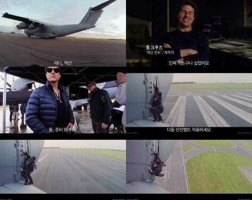 공개된 영상 속에는 이륙하는 비행기에 매달리는 아슬아슬한 액션을 스턴트 없이 맨몸으로 하는 톰 크루즈의 모습이 담겼다. 톰 크루즈는 "촬영 전날 잠을 잘 수 없었다"며 "찍는 날이 되니 '진짜 찍는 구나' 싶었다"고 소감을 밝혔다.