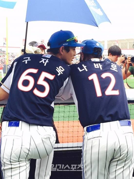 구자욱(왼쪽)이 올스타전 행사 도중 나바로와 대화를 나누고 있다.