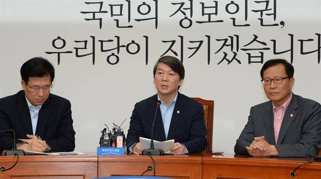 새정치민주연합 신경민(왼쪽) 의원과 안철수(가운데) 국민정보지키기 위원장이 19일 국회에서 국정원의 해킹 사건에 대한 기자간담회를 열었다. 오대근기자 inliner@hankookilbo.com