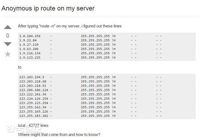 또다른 증거가 있다. 세계 각국의 서버 운영자들이 모인 커뮤니티인 '슈퍼유저닷컴'에 올라온 한 게시물이다. 이 게시물을 올린 이는 "내 서버에 이상한 점이 있다"며 자신도 모르게 라우팅 테이블이 변경된 것을 공개했는데, 그 테이블에 있는 IP 목록 중 이번에 공개된 한국 IP(223.222.241.34)가 하나 들어있다. 말레이시아의 IP들로부터 한국과 중국의 IP들로 패킷을 보내도록 돼 있는 것으로 보인다. 만약 이 한국 IP가 디도스 공격에 사용됐다면 말레이시아의 IP들이 한국의 IP로 디도스 공격을 수행했어야 한다. 국정원 주장처럼 한국의 IP가 공격을 한 게 아니라 오히려 받았어야 한다는 말이다.