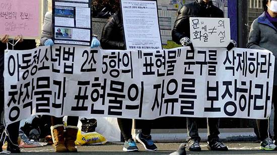 만화가들도 나섰다. 이들이 그린 만화 탄원서가 법원에 답지했다. '처벌 조항의 모호성'을 가장 큰 문제로 보았다. 아동·청소년의 성을 보호하자는 뜻에는 이견이 없으나, 아청법 제2조5항은 그 목적과 상관이 없다고 봤다. 오히려 창작자의 상상력을 옥죄고 표현의 자유를 침해한다고 반발했다. 드라마로까지 제작된 만화 <풀하우스> <메리는 외박 중> 등을 그린 원수연 만화가는 2조5항을 독소 조항이라고 딱지를 붙인 불도저 그림을, 한국예술종합학교 교수인 박재동 만화가는 청소년 성 문제를 다루는 만화가를 징역 5년에 처하려고 하는 수사기관의 모습을 그려 법원에 보냈다. 사건을 맡은 수원지방법원 안산지원 형사7단독 문형주 판사는 2013년 8월 위헌 법률 심판 제청을 했다. 비슷한 사건 두 개가 더 합쳐져 헌법재판소로 갔다.