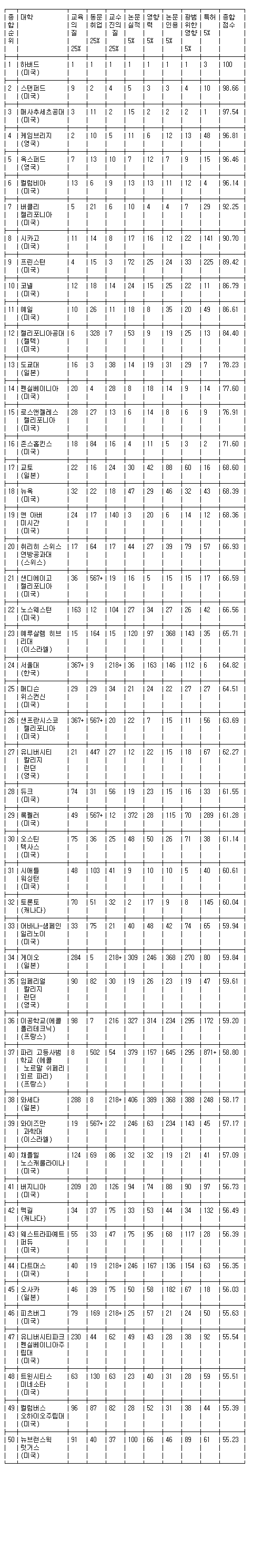 평가 요소들 중에서는 ▲ 대학 규모 대비 주요 국제상을 받은 동문들의 수로 따진 '교육의 질'(25%) ▲ 대학 규모 대비 세계 주요 기업들에서 최고경영자(CEO) 자리에 오른 적이 있는 동문들의 수로 따진 '동문 취업'(25%) ▲ 주요 국제상을 받은 연구자들의 수로 따진 '교수진의 질'(25%)의 비중이 높았다.
