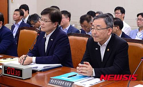 【서울=뉴시스】전신 기자 = 최양희 미래창조과학부 장관과 최성준 방송통신위원장이 27일 오후 서울 여의도 국회에서 열린 제1차 미래창조과학방송통신위원회 전체회의에서 의원들의 질의를 듣고 있다. 2015.07.27.