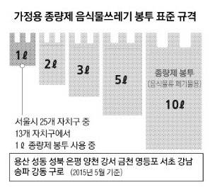 쓰레기 종량제 봉투의 표준규격은 환경부의 종량제 지침에 따라 결정된다. 다만 폐기물관리법상 세부 내용은 각 지방자치단체가 조례로 정할 수 있게 돼 있다. 지역마다 보급하는 종량제 봉투의 용량에 차이가 있는 것은 이 때문이다. 현행 종량제 봉투 표준규격은 1ℓ부터 시작하지만 실제 이용은 지자체의 재량에 달려 있다. 이 때문에 서울시 25개 구 중 용산, 영등포 등 13개 구에서만 소형인 1ℓ짜리 종량제 봉투를 보급하고 있다.