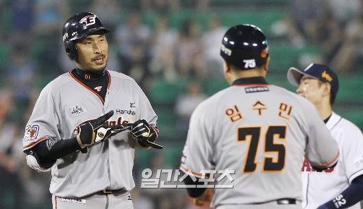 '2015 타이어뱅크 KBO 리그' 프로야구 한화 이글스-두산 베어스 전이 30일 잠실야구장에서 진행됐다. 한화 김경언이 7회초 1사 만루때 우중간 2루타로 2타점을 올리며 임수민 주루코치에게 보호장비를 넘기고 있다.