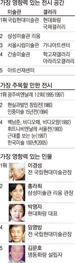 20세기 한국미술 전시공간 가운데 가장 영향력 있는 곳은 미술관으로는 국립현대미술관, 화랑으로는 현대화랑과 국제갤러리(공동), 대안공간으로는 대안공간 루프가 꼽혔다. 또 가장 영향력 있는 인물은 이경성 전 국립현대미술관장이 1위였고 홍라희 삼성미술관 리움 관장, 박명자 현대화랑 대표가 나란히 2위를 차지했다. 가장 주목할 만한 전시는 광주비엔날레 1·2회(1995·1997)에 이어 현실과발언 창립전(1980), 민중미술 15년전(1994) 순이었다.