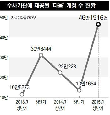 올해 상반기에 다음카카오 사용자에 대해 수사기관에 정보가 제공된 계정 수가 지난해 상·하반기에 견줘 두세 배 넘게 늘어난 것으로 나타났다. 지난해 10월에 '카카오톡 사찰 논란'에 휘말렸던 다음카카오가 법원이 발부한 압수수색 영장에 따라 요구 사항을 집행한 영장 건수는 올해 들어 오히려 줄었으나, 압수수색 영장 한 건이 요구한 계정 수가 크게 늘어난 결과다.