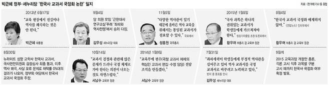 최근까지 야당과 역사학계·교육계는 물론 교육부 내부에서조차 정부가 국정화라는 무리수를 두지는 않으리라는 전망이 우세했다. 특히 국정화 의지가 강했던 김기춘 청와대 비서실장이 2월에 물러난 뒤론 이런 전망에 무게가 실렸다. 하지만 새누리당이 7월22일 열린 고위 당·정·청 회동에서 국정교과서 문제를 의제로 다룬 것으로 알려진 데 이어, 김 대표와 황 부총리가 잇따라 국정화 추진을 언급하자 분위기가 급반전했다. 정부는 2015 교육과정 개정안 총론·각론 고시가 이뤄지는 9월까지 한국사 교과서의 국정화 여부를 결정해야 하는데, 이를 코앞에 둔 중요한 시점에 연거푸 의미심장한 발언이 나온 탓이다.