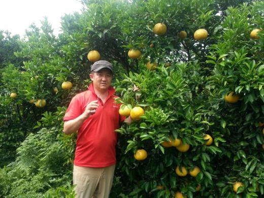 | 제주도 조천읍의 하귤 나무 밭 앞에 선 지철 대표 |