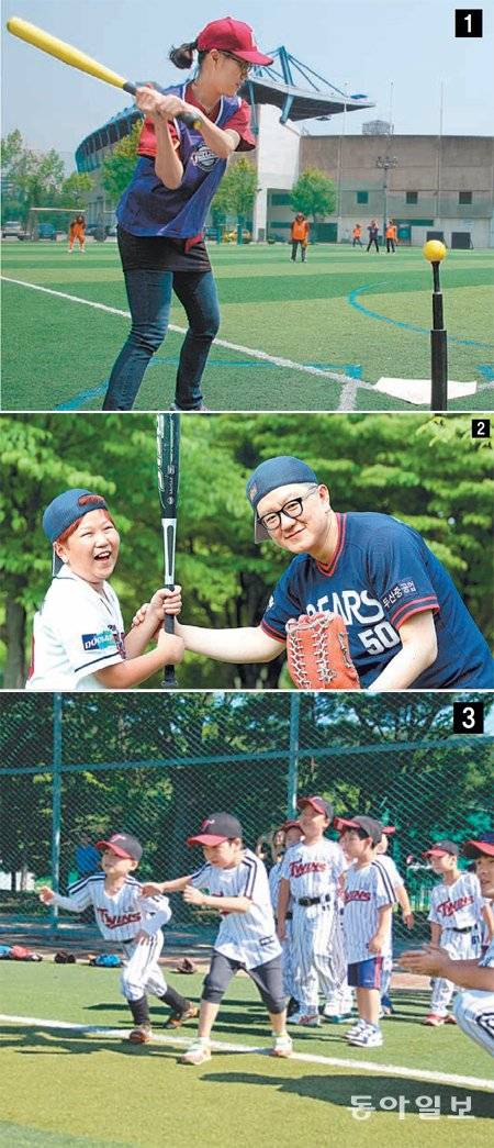 | 넥센의 ‘주부야구특공대’ 회원이 T볼 경기를 하고 있다 ①. 대를 이어 두산(옛 OB) 열혈 팬이 된 이득재 씨(오른쪽)와 아들 동준 군 ②. 구단 초청 이벤트에 참가한 LG 어린이 회원들 ③.김미옥 기자 salt@donga.com·넥센 LG 제공 |