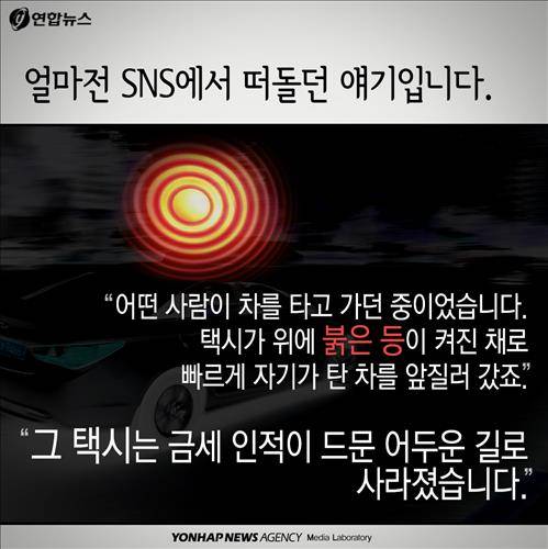 (서울=연합뉴스) 김태균 기자·최지녕 인턴기자 = 택시 지붕의 표시등이 빨간색으로 깜빡이는 것을 본 적이 있습니까? 이 이유 모를 붉은 등을 두고 최근 SNS(사회관계망 서비스)에 글이 돌고 있다는데요. 어떤 사연일까요?