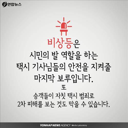 비상등은 시민의 발 역할을 하는 택시 기사님들의 안전을 지켜줄 마지막 보루입니다. 또 승객들이 자칫 택시 범죄로 2차 피해를 보는 것도 막을 수 있습니다.