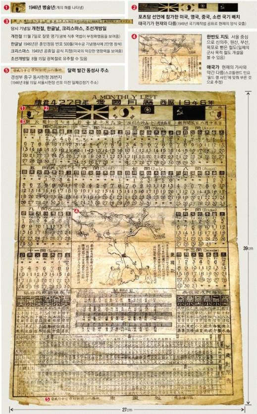 태극기 양 옆에는 1945년 7월 26일 일본에 항복을 권고하고, 일본에 대한 전후 처리 방침을 표명한 ‘포츠담 선언’에 참가했던 미국과 영국, 중국, 소련 국기가 배치됐다. 달력의 중국 국기는 현재 중화인민공화국의 오성홍기가 아닌 중화민국(대만)의 청천백일만지홍기다. 당시는 중국 총통이던 장제스가 마오쩌둥과 치른 국공 내전에서 패하기 전으로 중화민국이 중국 본토를 통치하고 있었다. 5개국 국기 맨 왼쪽과 오른쪽에 있는 개는 1946년이 병술년(丙戌年) ‘개의 해’임을 알리고 있다.