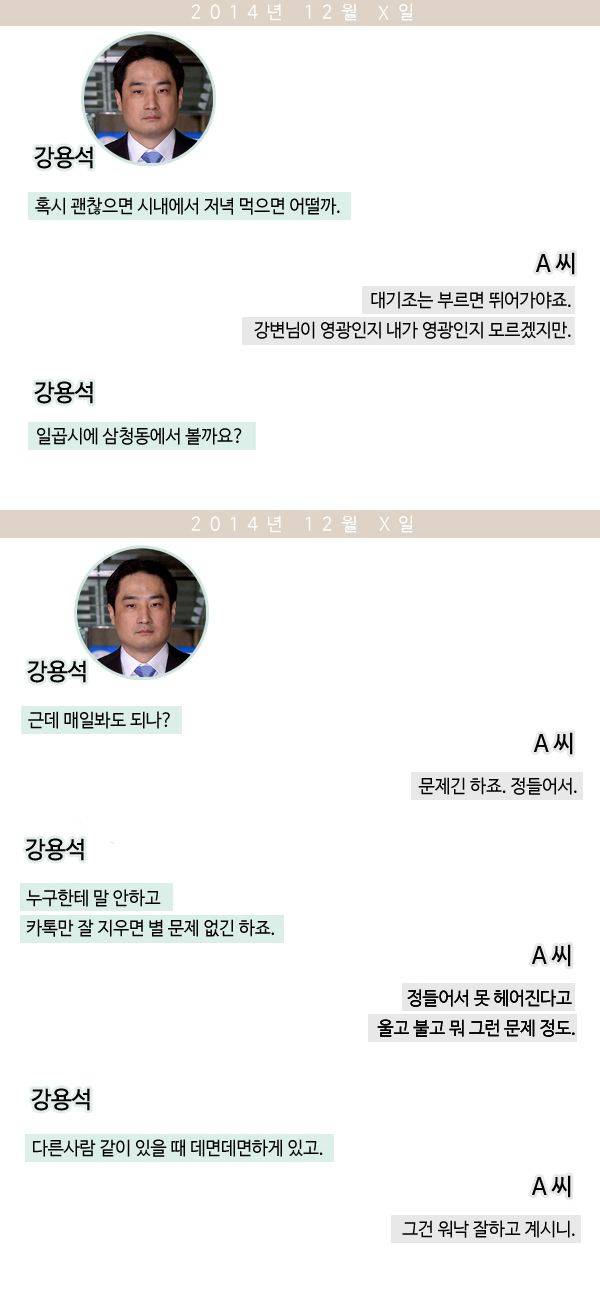 강용석은 '지침'을 내리기도 했다. "카톡만 잘 지우면 별 문제는 없다", "다른 사람과 같이 있을 때는 데면데면하게" 등의 말로 보안을 당부했다.