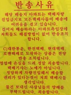 | 택배차량 진입이 막힌 한 아파트 단지에 배송됐다 반송된 상품에 반송된 사유를 알리는 안내문이 붙어 있다 / 인터넷 화면 캡처 |