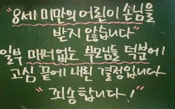 | 한 커피전문점에서 소란을 방치하는 부모 탓에 어린이 손님을 받지 않겠다는 내용의 공고를 내건 모습. / 인터넷 화면 캡처 |