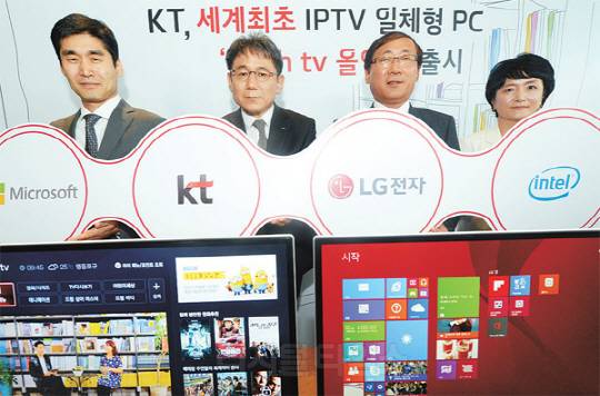 KT는 27일 서울시 광화문 올레스퀘어에서 IPTV 기능이 내장된 일체형 PC '올레TV 올인원'을 공개하고, 오는 31일 출시한다고 밝혔다. LG전자와 함께 개발한 이 제품은 IPTV 셋톱박스, 컴퓨터 본체, 27인치 모니터, 스피커를 하나로 합친 것으로, PC를 구동하지 않고도 바로 IPTV를 실행할 수 있도록 전용 리모컨을 제공한다. (왼쪽부터) 최기영 한국마이크로소프트 대표, 이필재 KT 미디어사업본부장, 이상윤 LG전자 B2B 그룹 전무, 권명숙 인텔코리아 대표가 IPTV 일체형 PC 출시를 알리고 있다.