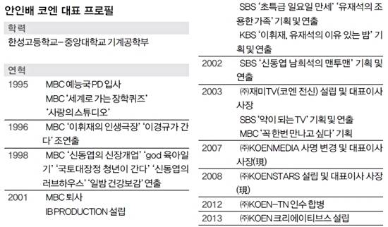최근 예능계 이슈와 트렌드의 중심엔 안인배 (주)코엔 대표가 있다. (주)코엔은 이경규·이휘재·유세윤·장동민·유상무 등 예능인 53명이 속해있는 기획사 (주)코엔스타즈와 외주제작사 (주)코엔미디어를 통합한 그룹이다. 코엔미디어에서 제작해 방송 중인 예능 프로그램은 KBS 2TV '슈퍼맨이 돌아왔다'·'나를 돌아봐'·SBS '아빠를 부탁해'·JTBC '닥터의 승부'·'최고의 사랑'·MBN '천기누설' 등 총 10개. 1년 매출만 평균 500억이다. 이중 코엔스타즈의 매출은 200억원. 코엔미디어의 매출은 300억원이다. 손에 꼽히는 예능 외주제작사와 비교했을 때 5배가 넘는 단연 독보적인 수치다.