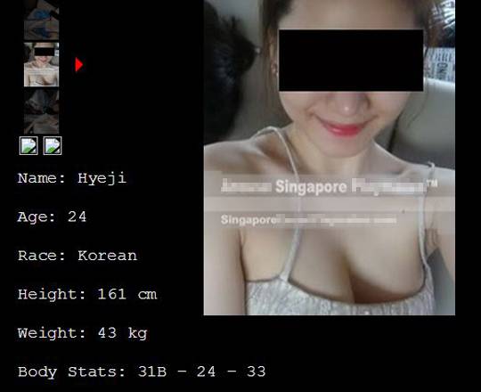싱가포르의 한 유명 성매매 업소는 최근 “한국인 여성을 특별히 모셔왔다”며 대대적으로 홍보했다. 업소는 “고풍적인 외모와 현대적인 옷차림은 그가 어디에서 왔는지를 상기시켜준다”며 “국적 문제로 고민이 있었으나, 우리와 함께 하는데 오랜 시간이 걸리지 않았다”고 덧붙였다.