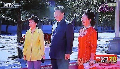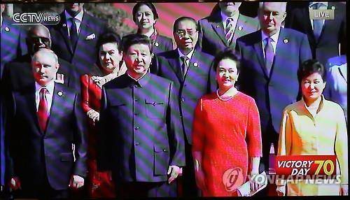 우선 박 대통령은 전승절 기념행사 시작 전 진행된 정상 및 외빈들과의 단체 기념사진 촬영 시에는 시 주석의 부인인 펑리위안(彭麗媛) 여사를 사이에 두고 시 주석의 왼편에 섰다.