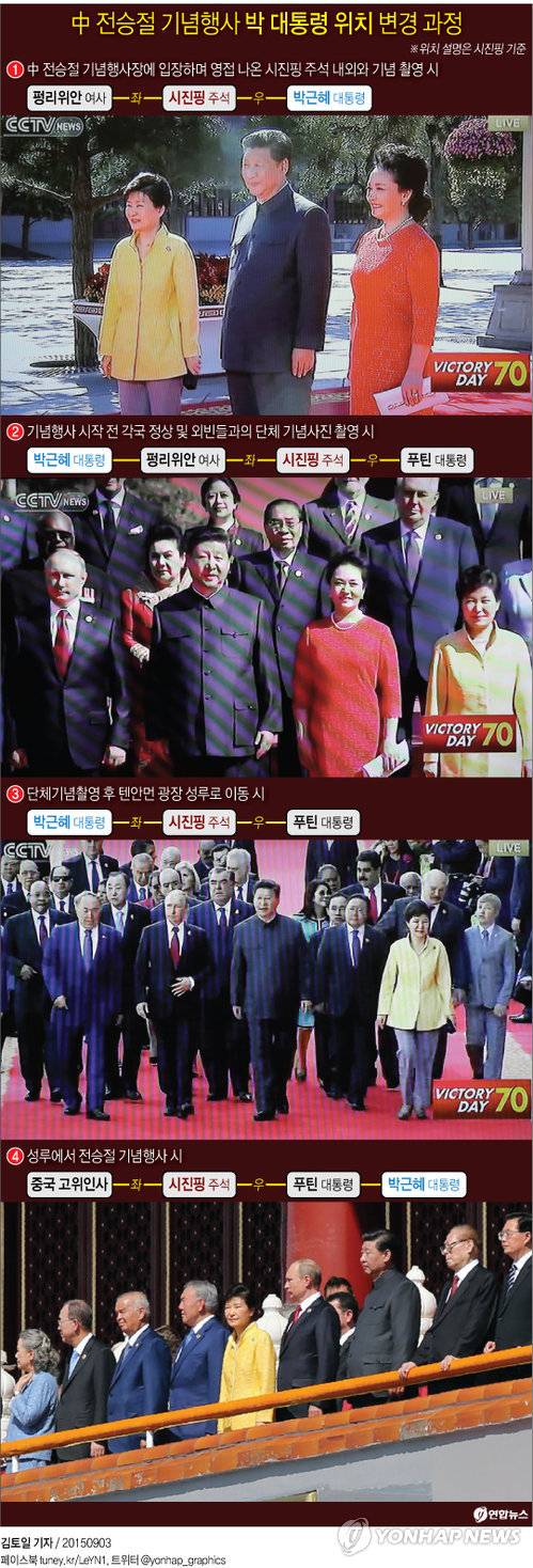 중국의 전승절 행사에서 박 대통령의 위치가 계속 바뀐 것은 중국이 박 대통령에게 각별한 예우를 하면서도 전통적 우방국인 러시아와의 관계도 같이 고려한 끝에 나온 조치로 분석된다.