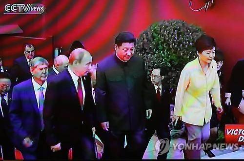 시 주석을 가운데 두고 좌우로 박 대통령과 푸틴 대통령이 자리할 수 있다는 일각의 예상과 달리 톈안먼 광장을 바라보는 시 주석 왼편으로 중국측 고위인사들이 자리하면서 박 대통령은 푸틴 대통령을 사이에 두고 시 주석과 나란히 섰다.