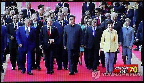 박 대통령은 단체 기념사진 촬영 후 시 주석 및 다른 정상들과 함께 선두에 서서 성루로 이동했다. 시 주석 오른쪽에는 푸틴 대통령이, 왼쪽에는 박 대통령이 서서 나란히 계단을 올랐다.