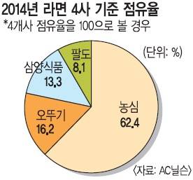 잇따른 히트작에 힘입어 농심은 1985년 3월 라면시잠 점유율에서 삼양식품을 처음으로 앞섰다. 점유율 역전을 당한 삼양식품은 엎친 데 덮친 격으로 1989년 우지(牛脂)파동을 겪으면서 점유율이 급감했다. 1997년 7년이 넘는 법정 공방 끝에 대법원에서 무죄판결을 받았지만 점유율은 꺾일 대로 꺾인 뒤였다.