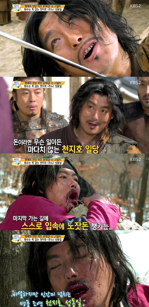 2010년 방송된 드라마 '추노'에 출연한 성동일은 은혜는 못 갚아도 원수는 꼭 같는 천지호 역을 맡아 사람 냄새 나는 악역 연기를 펼쳤다. MC들은 '추노' 속 성동일 연기를 보며 감탄을 금치 못했다.