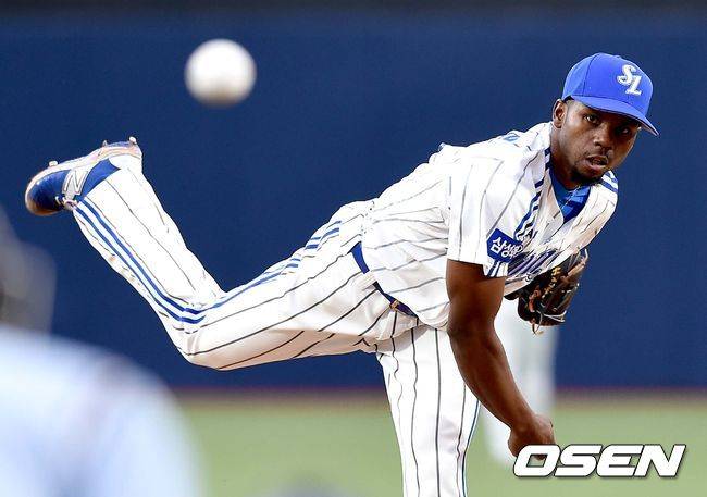 삼성 선발 피가로가 힘차게 공을 뿌리고 있다.