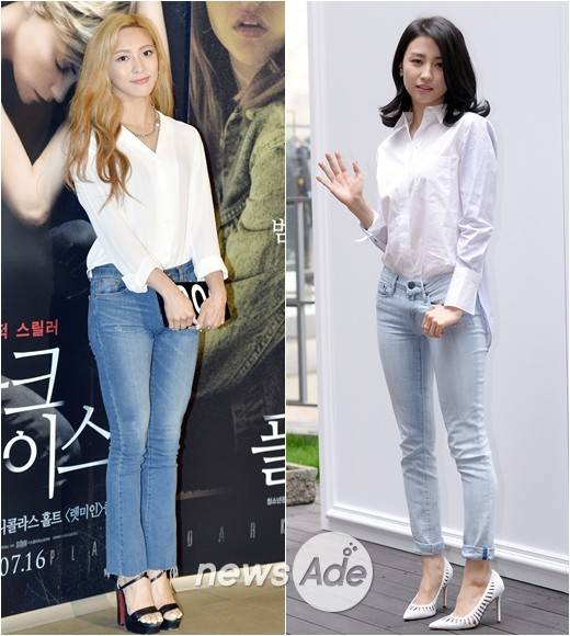 걸그룹 에프엑스(F(x)) 멤버 루나처럼 셔츠에 부츠컷 데님 팬츠를 입으면 트렌디함을 더할 수 있다. 반대로 배우 박하선처럼 타이트한 데님 팬츠를 롤업해서 매치하면 꾸민 듯 안 꾸민 듯 자연스러운 스타일을 연출할 수 있다. 여기에 여성스러움을 더하고 싶다면 이들처럼 하이힐을 착용하자.