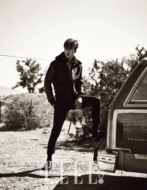 여름 한낮의 LA에 내리쬐는 햇빛은 정신을 몽롱하게 할 만큼 뜨거웠다. 수많은 해외 팬의 사랑을 받는 별 중의 별을 사막 한가운데 데려다 놓은 걸 자책할 만큼. 그러나 하늘과 땅의 경계선이 또렷이 펼쳐져 있는 이국적인 공간에 서 있는 이민호는 그 어느 때보다 낯설고 근사했다. LA는 배우 이민호에게 꽤 특별한 도시다. 한류 스타의 자리를 다시 한 번 공고히 해 준 드라마 <상속자들>(2013)의 해외 로케이션 촬영지였기 때문이다. “드라마가 끝난 지 2년 만이에요. 늘 다시 한 번 와보고 싶었는데 이제야 오게 됐네요.” 김탄의 귀환을 환영하는 재미있는 우연도 일어났다. 에디터가 골라둔 촬영 장소가 극중에서 은상(박신혜)과 함께 우연히 모텔에서 하룻밤을 청하는 신을 찍었던 바로 그 장소였던 것이다. 그러나 이번에 준비된 <엘르>의 시나리오는 백마 탄 왕자님이 등장하는 로맨스는 아니었다. 포토그래퍼 홍장현은 이민호와 광고 촬영을 하면서 언젠가 ‘웃지 않아도 되는’ 화보를 찍자고 약속했다. 황량한 들판과 낡은 모텔, 그 앞에 세워진 빈티지 카 그리고 웃음기를 지운 이민호가 어우러진 신들은 서부 누아르 영화의 스틸 같았다. 전작 <강남 1970>에서 비췄던 그의 무르익은 남성미가 드디어 발화점을 찾은 듯했다.