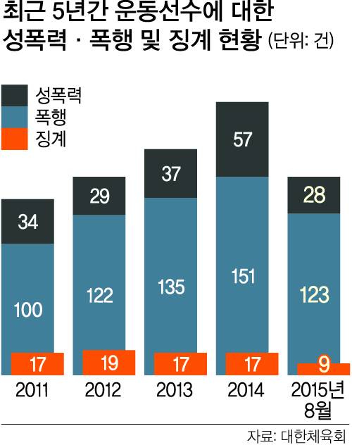문제는 선수들에 대한 인권 관리가 무방비 상태에 있다는 점이다. 피해자들이 신고·상담할 수 있는 권익센터는 서울 한 곳이 유일하고 전문 상담사는 4명밖에 없다. 이 의원은 “권익센터는 폭행 문제 상담을 보다 적극 실시하고 가해자는 보다 강력히 처벌해야 한다”고 지적했다.