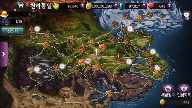 천하통일 모드는 55개 성을 모두 점령해가는 모드로, 흔히 접할 수 있는 전략 게임 삼국지에 견줘도 손색없는 방대한 콘텐츠를 자랑한다. 게이머가 점령한 성에서는 다양한 이벤트가 발생하며, 다른 성을 점령하기 위해서는 해당 성의 민심을 깍은 뒤 전투를 진행해야하는 전략적인 요소도 가미됐다. 이 뿐만이 아니다. 천하통일 모드에는 산적토별이나 점령전 등의 전투는 물론 탐색을 통해 '진연희' 캐릭터를 획득하기 위한 특별한 이벤트도 마련됐다. 여기에 특정 성에 게이머가 보유한 캐릭터를 영주로 임명할 수도 있으며, 연달아 발생하는 이벤트와 민심관리 등으로 천하통일이 결코 쉽지 않다. 이 대표는 천하통일 콘텐츠에 의도한 재미가 비공개 테스트를 통해 이미 검증 된 만큼 자신 있다고 설명했다.