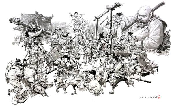 주인공은 바로 드로잉 아티스트 김정기 작가입니다. 아마 작가의 라이브 드로잉 장면을 이미 한 번쯤 직접 보신 분도 있을 겁니다. 저는 지난 4월 서울 동대문디자인플라자(DDP)에서 열린 ‘아트 토이 컬쳐 2015’ 행사장에서 김정기 작가의 라이브 드로잉 장면을 직접 볼 기회가 있었습니다. 전시장 한 가운데 커다란 캔버스를 세워 놓고 세계적인 스마트폰 게임 ‘클래시 오브 클랜’을 주제로 즉석 드로잉 쇼를 선보이는 자리였는데, 그날도 정말 많은 사람이 주변을 에워싼 채 이 신기한 장면을 지켜봤습니다. 밑그림도 없고, 그렇다고 뭘 보고 그리는 것도 아닌데, 일반인은 상상하기 어려운 속도로 부단히 선을 긋고 형상을 만들어나가다니 놀라고 감탄할 수밖에요. 이 장면을 화면에 담아 그날 9시 뉴스에 보도했습니다. 나중에 작가에게 얘기를 했더니 본인도 알고 있더군요. 그런데 이번엔 그보다 더 야심 찬 계획이었습니다. 작가 자신도 지금까지 시도해보지 않았던, 캔버스 50개를 스토리 있는 그림으로 채우겠다는, 그것도 즉석에서 라이브로 보여주겠다는 것이었으니 그 주말 오후 무더위를 뚫고 금쪽같은 시간을 내서 사람들이 전시장에 모인 까닭이 이해될 만도 합니다.